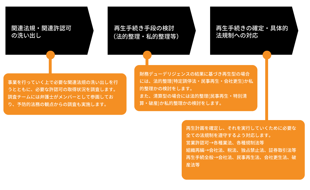対象会社が、事業を行っていく上で必要な関連法規の洗い出しを行うとともに、必要な許認可の取得状況を調査します。再生手続を実行し、再生を達成するについては、法的整理又は私的整理のいずれかのスキームに基づき進められますので、その許認可の継承方法について検討します。事業再生スキームにおいて選択されるスキームの枠組み・手続き・法務上の取扱いについて、これらの分野に関して豊富な経験と知識を有した弁護士及び専門家がアドバイスを提供いたします。