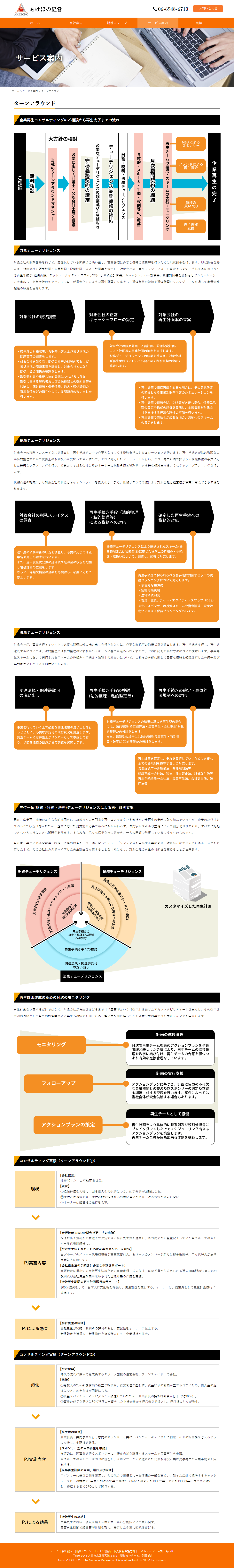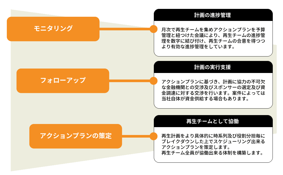 当社は、再生に必要な財務・税務・法務の観点を三位一体となったデューデリジェンスを実施する事により、対象会社に生じるあらゆるリスクを想定した上で、その会社にカスタマイズした再生計画を立案することを可能になり、対象会社の再生の可能性を高めることが出来ます。
