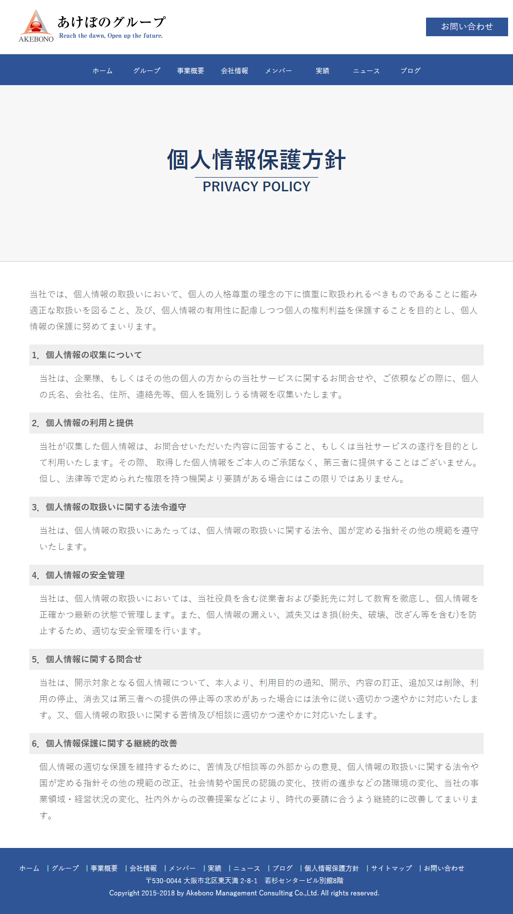 当社では、個人情報の取扱いにおいて、個人の人格尊重の理念の下に慎重に取扱われるべきものであることに鑑み適正な取扱いを図ること、及び、個人情報の有用性に配慮しつつ個人の権利利益を保護することを目的とし、個人情報の保護に努めてまいります。